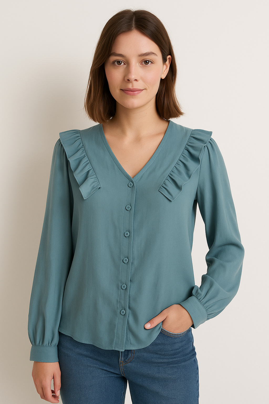Details: Flattering V-neckline, delicate button-down front with softly gathered sleeves