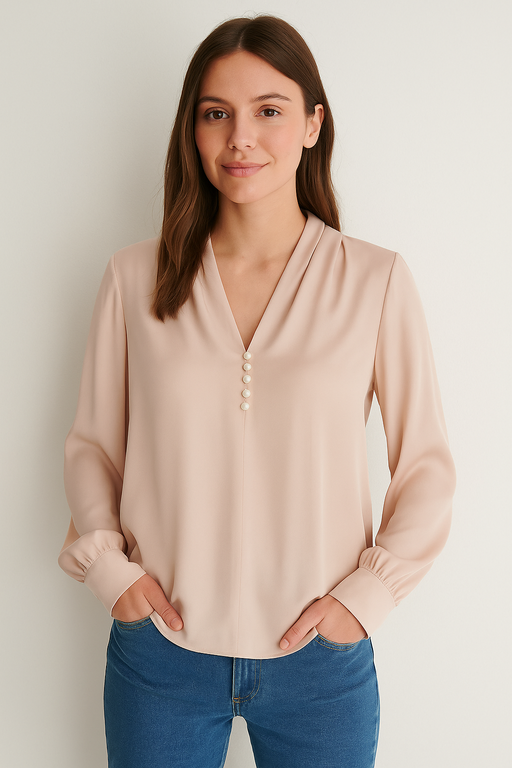 Details: Pearl buttons, pleated shoulder, V-neck with soft fold-over lapel