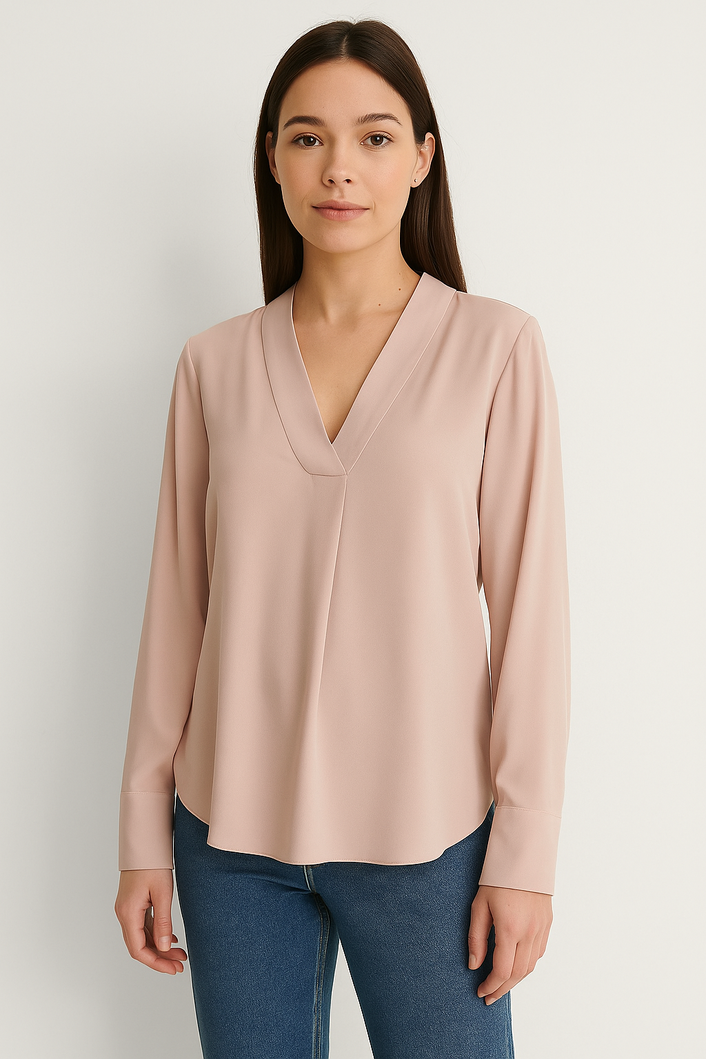 Detail: Muted rose top with a V-neckline and subtle overlapping panel detailing