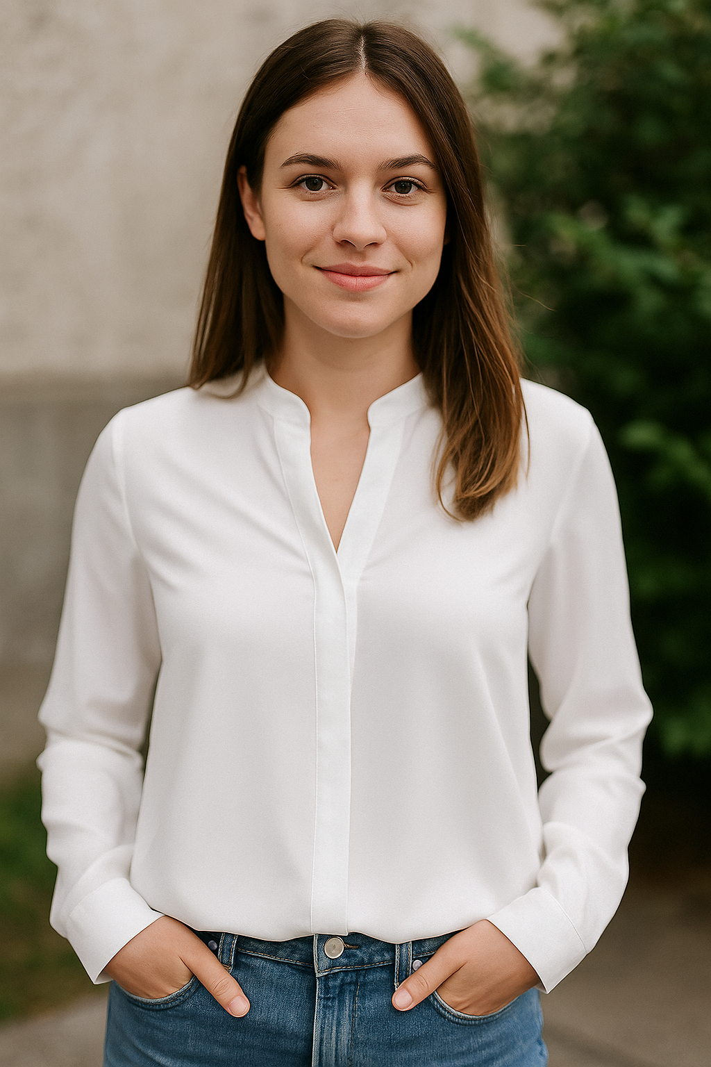 Detail: Minimalist mandarin collar neckline with a V-slit opening